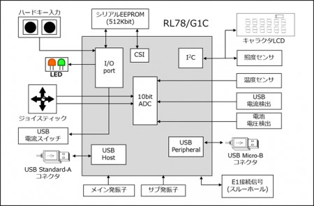 その他、照度・温度センサデータのLCD表示やシリアルEEPROMへの格納、時刻表示、電池残量測定などの機能を搭載。USB機能や充電機能を備えた周辺機器の開発期間とコストを大幅に削減できるとしている。