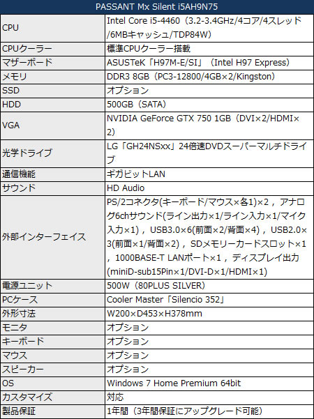 エントリーモデル「PASSANT Mx Silent i5AH9N75」(基本構成売価税抜89,980円)は、CPUにIntel Core i5-4460を搭載。グラフィックスカードはNVIDIA GeForce GTX 750 1GBで、Kingston製DDR3 8GB(4GB×2)メモリ、500GB HDD、LG製DVDスーパーマルチドライブ等で構成される。なお搭載電源ユニットは80PLUS SILVER認証の500Wモデル。