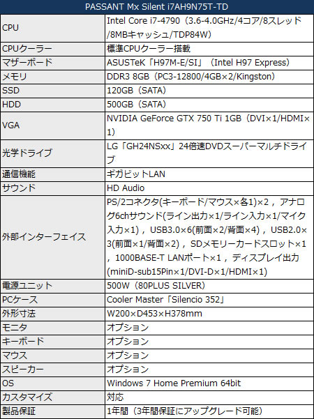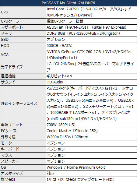 上位モデル「PASSANT Mx Silent i7AH9N76」(基本構成売価税抜119,980円)は、CPUにIntel Core i7-4790を搭載。グラフィックスカードはNVIDIA GeForce GTX 760 2GBで、Kingston製DDR3 8GB(4GB×2)メモリ、500GB HDD、LG製DVDスーパーマルチドライブ等で構成される。なお搭載電源ユニットは80PLUS認証の700Wモデル。