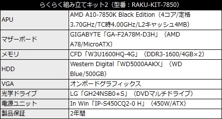 パーツ構成は、APUがAMD A10-7850K Black Edition(4コア/定格3.70GHz/TC時4.00GHz/L2キャッシュ4MB)、マザーボードがGIGABYTE「GA-F2A78M-D3H」(AMD A78/MicroATX)を採用。メモリはCFD「W3U1600HQ-4G」(DDR3-1600/4GB×2)、HDDはWestern Digital「WD5000AAKX」(WD Blue/500GB)、光学ドライブはLG「GH24NSB0+S」(DVDマルチドライブ)で、In Win「IP-S450CQ2-0 H」(450W/ATX)が同梱される。