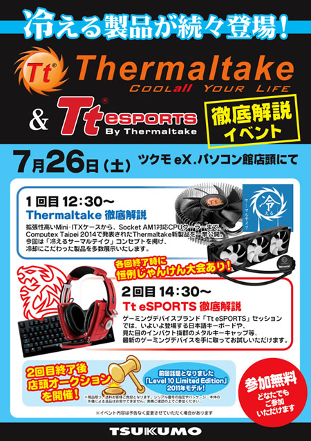 ThermaltakeおよびTt eSPORTS製品の徹底解説イベントが、2014年7月26日(土)TSUKUMO eX.で開催。第1回は12:30から「Thermaltake徹底解説」、第2回は14:30から「Tt eSPORTS徹底解説」が行われる。