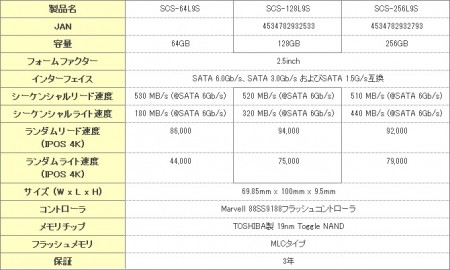 コントローラにはMarvell製サーバーグレードIC「88SS9188」を採用。さらにパフォーマンスと信頼性に定評のある東芝製19nmプロセスMLC NANDフラッシュを組み合わせることで、シーケンシャル読込最大530MB/sec、書込最大440MB/sec、ランダム読込最大94,000 IOPS、書込最大79,000 IOPSの高速アクセスを実現した。
