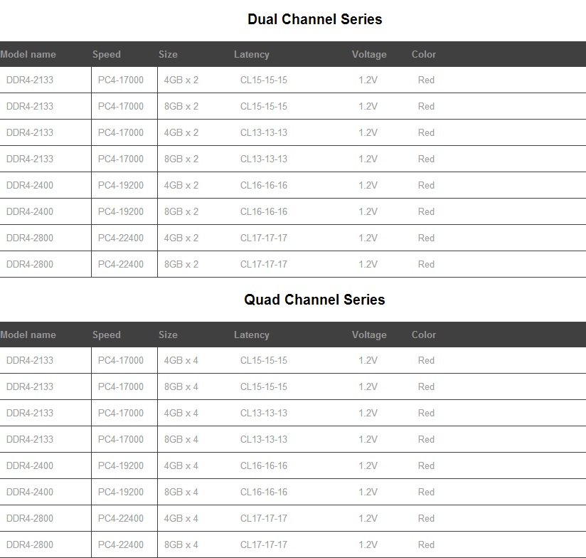 動作クロックは2,133MHz、2,400MHz、2,800MHzの3モデルで、容量は8GB(4GB×2)、16GB(4GB×4/8GB×2)、32GB(8GB×4)がラインナップ。すべてのモジュールはテスト済みで出荷され、永久保証が提供される。