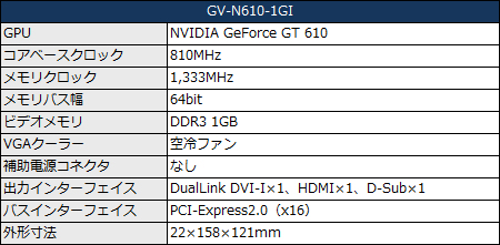 搭載GPUはNVIDIA GeForce GT 610で、コアクロック810MHz、メモリクロック1,333MHz、メモリバス幅64bitとなり、DDR3 1GBのビデオメモリを実装。インターフェイスにはDualLink DVI-I×1、HDMI×1、D-Sub×1を備えた。