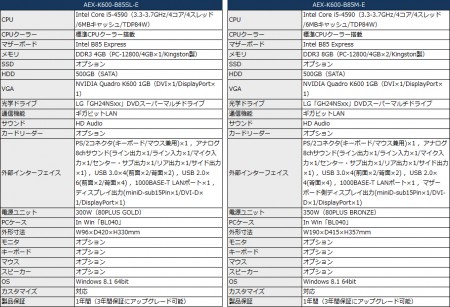 スリムタワー型「AEX-K600-B85SL-E」(基本構成売価税抜85,980円)は、DDR3 4GBメモリ(PC3-12800/4GB×1/Kingston製)と500GB HDD、DVDスーパーマルチドライブ構成。ミニタワー型「AEX-K600-B85M-E」(基本構成売価税抜89,980円)は、メモリ容量をDDR3 8GB(PC3-12800/4GB×2/Kingston製)とした。なお搭載される電源ユニットは、前者が300W(80PLUS GOLD)、後者が350W(80PLUS BRONZE)。