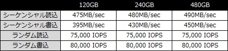 転送速度は容量によって異なるが、最も高速な480GBモデルではシーケンシャル読込490MB/sec、書込450MB/sec、ランダム読込85,000 IOPS、書込80,000 IOPS。消費電力はアイドル時0.6W、アクティブ時3.45W、動作温度は0~70℃。
