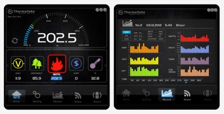 さらに以前詳細検証をお届けした「Toughpower DPS」シリーズ同様、本体とPCをUSBケーブルで接続することで利用できる専用アプリケーションソフト「Smart DPSApp Software」に対応。電圧やファン回転数、消費電力などに加え、概算コスト等をリアルタイムでモニタリング。各種SNSとの連携機能も備えた。