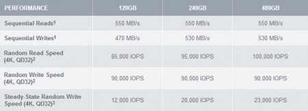 転送速度は容量によって異なるが、シーケンシャル読込最高550MB/sec、書込530MB/sec、ランダム読込100,000 IOPS、書込90,000 IOPS。また長期運用時でもパフォーマンス低下が少ないのも特徴で、480GBモデルでは定常状態でも23,000 IOPSの高速アクセスを可能にした。