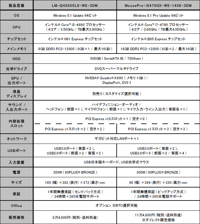 「LM-QH300SL6-WS-3DM」(基本構成売価税抜84,800円)は、CPUにIntel Core i5-4690を搭載する、Intel H81 Expressチップ構成。グラフィックスカードはNVIDIA Quadro K600 1GBで、DDR3 8GBメモリ、500GB HDD、DVDスーパーマルチドライブ等を備えた。なおOSはWindows 8.1 Update 64bitがプリインストールされる。