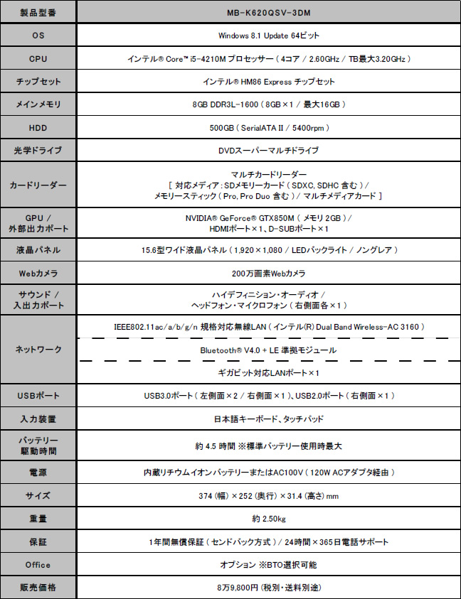 「MB-K620QSV-3DM」(基本構成売価税抜89,800円)は、唯一の15.6型ワイドフルHD液晶(1,920×1,080)ノートPC。CPUはIntel Core i5-4210Mで、チップセットにIntel HM86 Expressを採用する。グラフィックスカードはNVIDIA GeForce GT 850M 2GBで、DDR3 8GBメモリ、500GB HDD、DVDスーパーマルチドライブ等を装備。OSにはWindows 8.1 Update 64bitがプリインストールされる。
