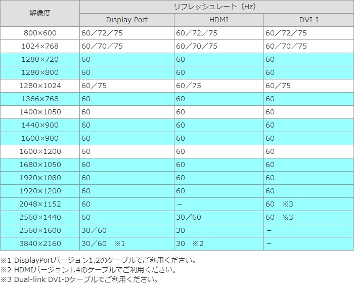 冷却ファンは2スロット専有のシングルファン構成で、メモリはGDDR5 2GBを搭載。対応APIはDirectX 11.2/OpenGL 4.4。外形寸法は、W111×D166×H36mm、重量約290g。消費電力は75Wで、補助電源コネクタは非搭載。なお対応リフレッシュレートおよび、解像度は以下の通り。