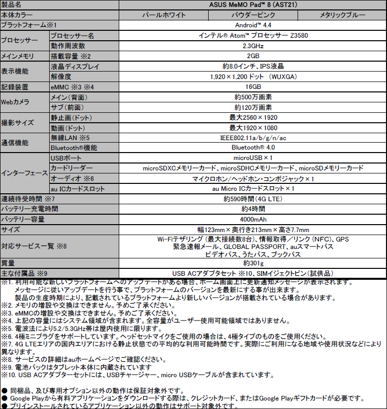 4G LTE対応の8インチタブレット「ASUS MeMO Pad 8(AST21)」が8月22日より、KDDI株式会社・沖縄セルラー株式会社より発売が開始される。カラーはパウダーピンク、メタリックブルー、パールホワイトの3色がラインナップされる。