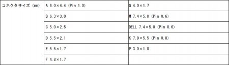 対応AC入力は100~240V。外形寸法はW91.4×D91.4×H31.8mm、重量280g。製品にはACケーブル(150cm)、DCケーブル(60cm)、取扱説明書兼製品保証書が付属される。なお同梱の変換コネクタサイズは以下の通り。