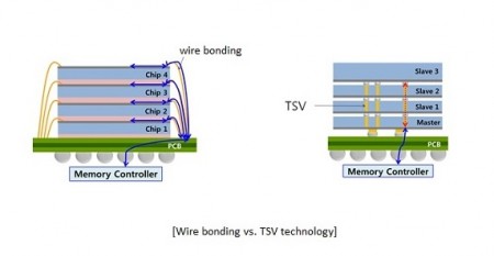 | 「3D TSV」では、積層シリコンに直接アクセスできるため、これまでの「wire bonding」に比べてアクセス速度も高速化できるという |