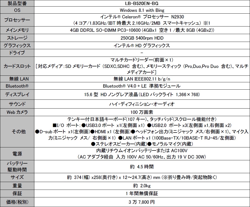 Bay Trail-Mこと、Intel Celeron N2930(4コア/定格1.83GHz/バースト時2.16GHz/L2キャッシュ2MB/TDP7.5W)を搭載する、15.6インチHDノートPCの新製品。OSには基本無料のWindows 8.1 with Bingがプリインストールされる。