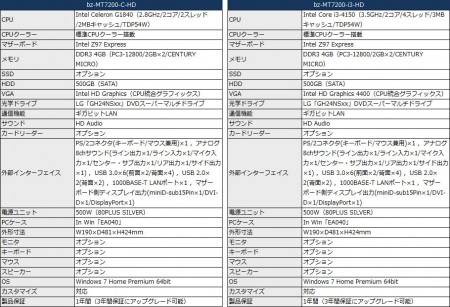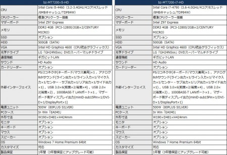 「bz-MT7200-i3-HD」(基本構成売価税抜59,980円)は、Intel Core i3-4150(3.5GHz/2コア/4スレッド/3MBキャッシュ/TDP54W)を搭載。「bz-MT7200-i5-HD」(基本構成売価税抜66,980円)は、Intel Core i5-4460(3.2-3.4GHz/4コア/4スレッド/6MBキャッシュ/TDP84W)。最上位の「bz-MT7200-i7-HD」(基本構成売価税抜85,980円)では、Intel Core i7-4790(3.6-4.0GHz/4コア/8スレッド/8MBキャッシュ/TDP84W)が搭載される。