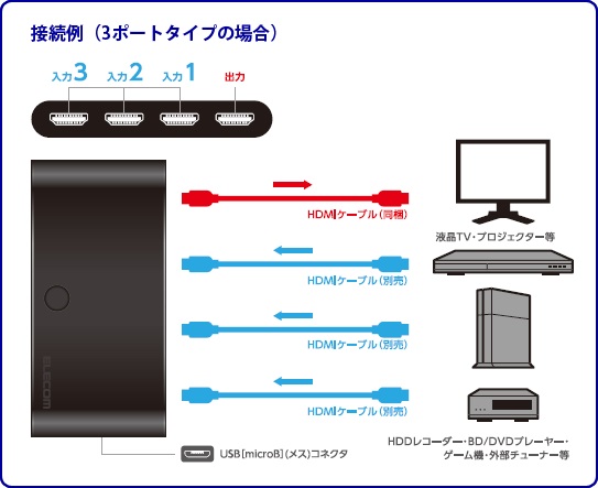 電源はHDMI機器からのバスパワー駆動で、補助電源コネクタとしてUSB micro-Bコネクタを搭載。HDMI機器の切り替えは本体上部のボタンで行い、HDMI機器の電源を入れると自動的に入力機器を変更する「自動切替機能」を備える。