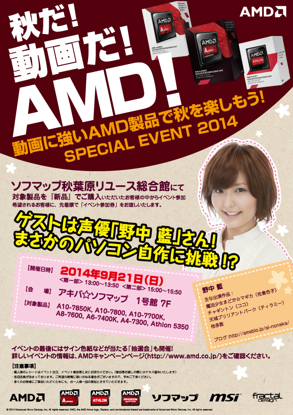 来る9月21日(日)、アキバ☆ソフマップ1号店7階において、日本AMD主催イベント「秋だ!動画だ!AMD!動画に強いAMD製品で秋を楽しもう!SPECIAL EVENT 2014」が開催される。