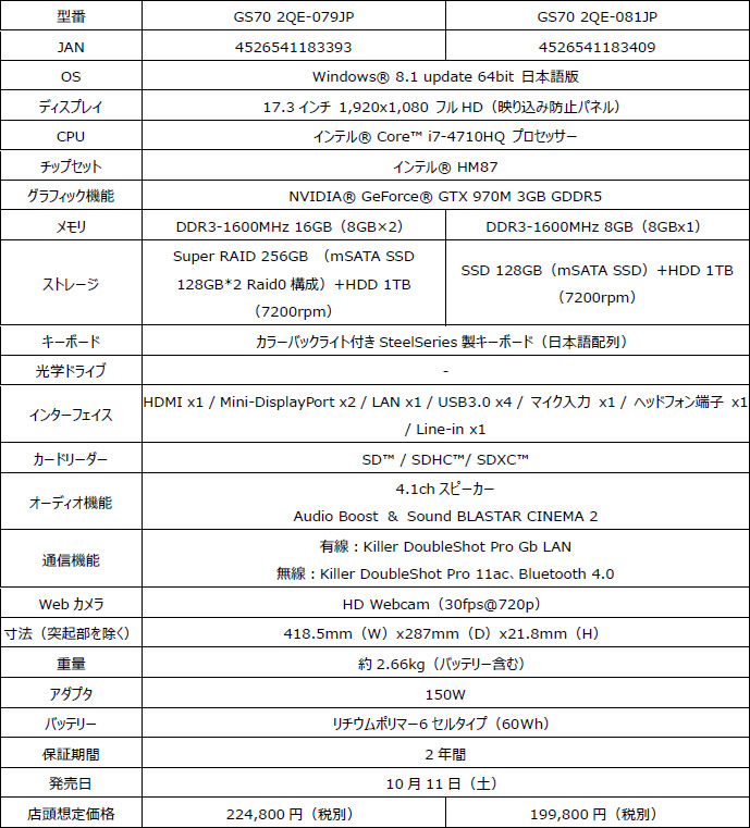 NVIDIA GeForce GTX 970Mを標準搭載させた、厚さ21.8mmの超薄型ゲーミングノートPCも同時発売。ラインナップは「GS70 2QE-079JP」(市場想定売価税抜224,800円)と「GS70 2QE-081JP」(市場想定売価税抜199,800円)の2機種が用意される。液晶サイズは17.3インチフルHD(1,920×1,080/ノングレア)。