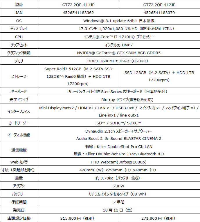 ハードウェア構成は共通で、Intel HM87 Expressチップをベースに、Intel Core i7-4710HQを搭載。メモリはDDR3 16GB(PC3-12800/8GB×2)で、ストレージは上位機種でSuper Raid 3 512GB(M.2 SATA SSD/128GB×4 RAID 0)+1TB HDD(7,200rpm)、下位機種で128GB SSD(M.2 SATA)+1TB HDD(7,200rpm)。光学ドライブに書込対応のBlu-rayが装備される。