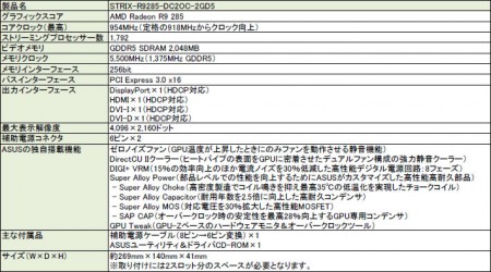 ASUSTeKのゲーマー向けプロダクト「STRIX」シリーズに属する、AMD Radeon R9 285搭載グラフィックスカード。バスインターフェイスはPCI-Express3.0(x16)。