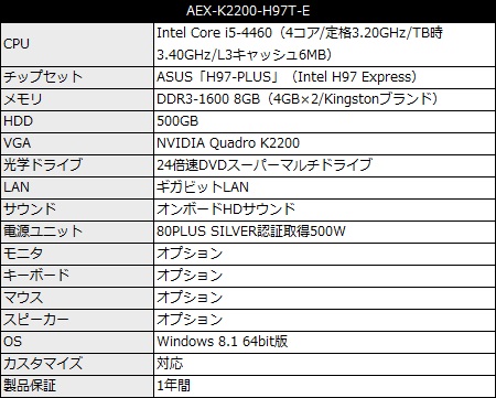 主なスペックは、CPUにCore i5-4460(4コア/定格3.20GHz/TB時3.40GHz/L3キャッシュ6MB)、マザーボードにASUS「H97-PLUS」(Intel H97 Express)を採用。メモリはDDR3-1600 8GB(4GB×2/Kingstonブランド)、ストレージは500GB HDDと24倍速DVDスーパーマルチドライブが内蔵され、USB3.0接続の外付けHDDクレードルが同梱される。