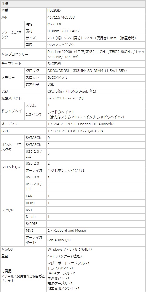 対応メモリはDDR3/DDR3L-SODIMM×1(1,333MHz/最大8GB)、ストレージベイはスリム光学ベイ×1(2.5インチシャドウベイ×1と併用)、2.5インチシャドウベイ×1。拡張スロットはmini PCI-Express×1で、インターフェイスは、USB3.0×1、USB2.0×6(フロント×2/リア×4)、音声入出力×5(フロント×2/リア×3)、D-Sub×1、HDMI×1、PS/2×2、ギガビットLAN×1などを備える。