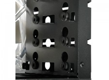 フロント部には、120mm(1,200rpm/39.76CFM/17.5dBA)のスリーブベアリングファンが標準装備され、HDDを効率よく冷却。また振動を抑えるため、HDDマウンタ部には防振用ゴムを搭載させた。
