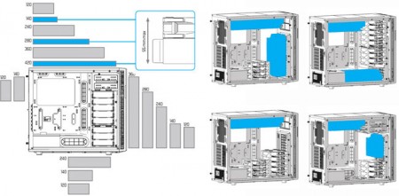 ドライブベイレイアウトは、5.25インチオープンベイ×2、2.5/3.5インチシャドウベイ×8、2.5インチシャドウベイ×2で、ケージ式ドライブベイは全て着脱可能。これにより、最大440mmの大型拡張カードや420mmまでのラジエターに対応する。