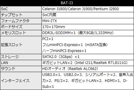 「BAT-I3」シリーズは、Bay Trail-DをオンボードさせたファンレスMini-ITXマザーボード。SoCの違いにより、Celeron J1800、Celeron J1900、Pentium J2900の3種類がラインナップされる。