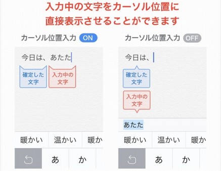 ユーザーからの強い要望に応えたもので、入力中の文字をカーソル位置に直接表示する「カーソル位置入力」機能を搭載。入力中の文字列で変換を行う、OS標準のインライン入力に近い動作を実現した。