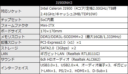 Bay Trail-D世代の4コアSoC、Celeron J1900(定格2.00GHz/TB時2.41GHz/キャッシュ2MB/TDP10W)をオンボードさせたファンレスMini-ITXマザーボードの新製品。
