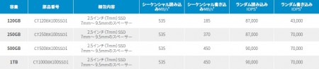 NANDフラッシュはこちらも製造プロセス16nmのMicron製MLC NANDで、コントローラはSilicon Motion「SM2246EN」を採用。転送速度は容量によって異なるが、最も高速な500GB/1TBモデルでは、シーケンシャル読込535MB/sec、書込450MB/sec、ランダム読込90,000 IOPS、書込70,000 IOPSに設定されている。