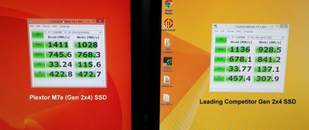 従来モデル「M6e」シリーズから帯域幅を2倍に拡張することで、パフォーマンスを向上。同社ブースで行われたデモでは、シーケンシャル読込1,400MB/sec、書込1,000MB/secの高速アクセスを実現しており、PCI-Express2.0(x4)対応SSDでは業界最速を謳う。