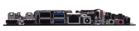 インターフェイスはUSB3.0×2、USB2.0×2、音声入出力×2。ネットワークはギガビットLAN×1(Realtek RTL8111G)で、ディスプレイ出力はHDMI×2、LVDS×1が用意され、デュアルディスプレイに対応する。