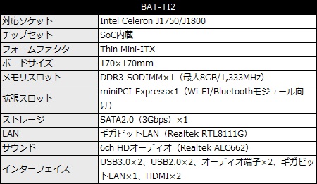 主なスペックは、メモリスロットはDDR3-SODIMM×1(1,333MHz/最大8GB)、ストレージはSATA2.0(3Gbps)×1で、拡張スロットはminiPCI-Express×1(Wi-FI/Bluetoothモジュール向け)を備える。