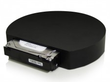 MacProに合わせてデザインされた、台座型外付けHDDクレードル。本体には容量6TBまでの3.5インチSATA HDDが1台収納可能。HDDの着脱は工具不要で、MacProを上に載せたまま水平にスライドするだけで簡単に抜き差しができる。