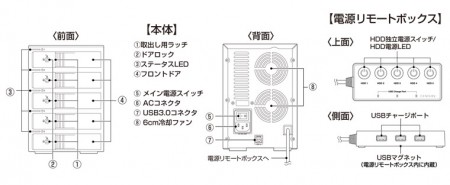 最大5台の3.5インチHDDを内蔵できる、USB3.0対応外付けHDDケースの新製品。ケーブル長1.8mの「電源リモートボックス」が付属され、手元でHDDの電源を個別にON/OFF可能。また3口のUSB充電ポート(各5V/2.1A)も実装され、タブレットやスマートフォンの充電もサポートされる。