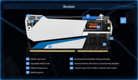 ハイパフォーマンスメモリを手がけるAVEXIRより、ユニークな発光ギミックを標準装備するDDR3メモリキット「Raiden」シリーズが登場。ギミックユニット「RAIDEN Tube」とメモリモジュールを金属製ヒートシンクで覆った大型メモリで、通電中は青く発光してケース内を照らしだす。