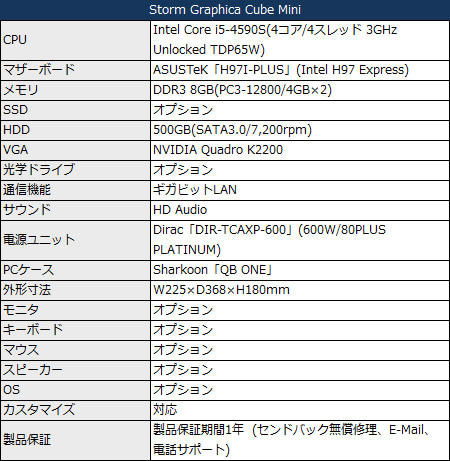 グラフィックスカードにNVIDIA Quadro K2200 4GBを標準で搭載する、クリエイター向けBTO。PCケースにはCube型Mini-ITXモデルSharkoon「QB ONE」を採用。設置場所を選ばない。