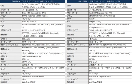 グラフィックカードはNVIDIA GeForce GTX 960 2GBを標準で備える他、DDR3 8GB(PC3-12800/4GB×2)メモリ、2TB HDD(※掲載時120GB SSD無料プレゼント中)、DVDスーパーマルチドライブで構成される。なお電源ユニットはSilverStoneブランドのSFX規格「SST-SX600-G」(650W/80PLUS GOLD)。
