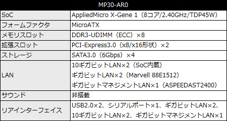 ARMv8アーキテクチャを採用する8コアSoC、AppliedMicro「X-Gene 1」(動作クロック2.40GHz/TDP最大45W)をオンボードさせたサーバー向けMicroATXマザーボード。SoC内蔵の10ギガビットLAN×2に加え、Marvell 88E1512によるギガビットLAN×2が追加され、並列処理が必要となるサーバーアプリケーション用のノードに向く。