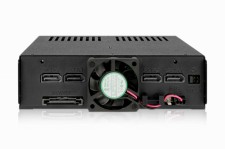 「MB324SP-B」は、5.25インチオープンベイに最大4台の2.5インチSSD/HDDを搭載できるホットスワップ対応リムーバブルケージ。