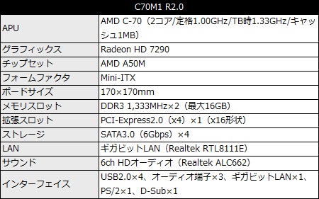 TDP 9Wのモバイル向けAPU、AMD C-70(2コア/定格1.00GHz/TB時1.33GHz/キャッシュ1MB)を搭載するMini-ITXマザーボードの新製品。GPUコアには動画再生支援機能UVD3を備えたRadeon HD 7290が内蔵され、省電力ながら優れたグラフィックス性能を備える。
