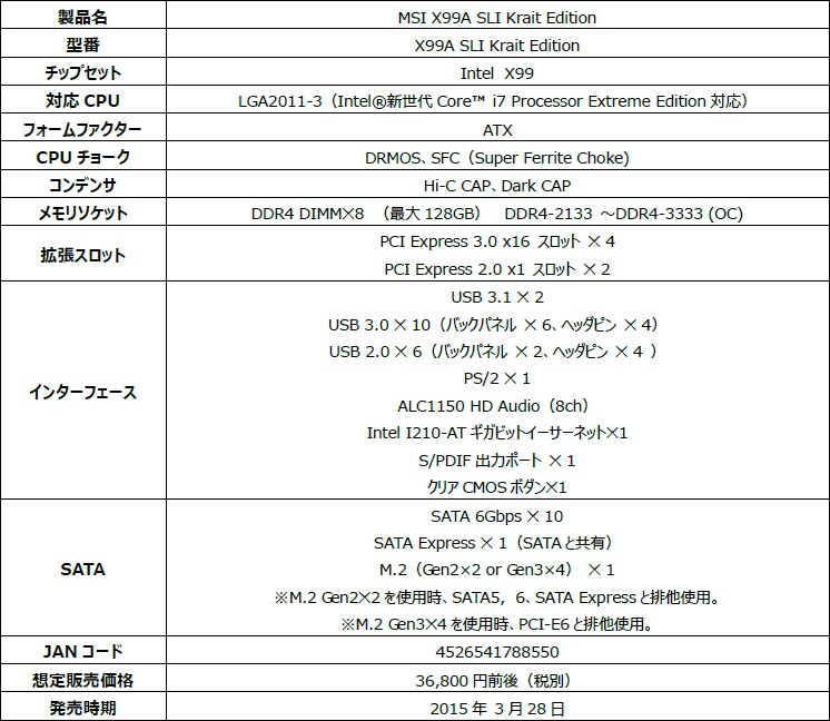 アマガサヘビをモチーフにした白と黒のコントラストが美しい、MSI「Krait Edition」シリーズから、USB3.1対応のIntel X99 Expressマザーボード「X99A SLI Krait Edition」が登場、28日より国内発売が開始される。