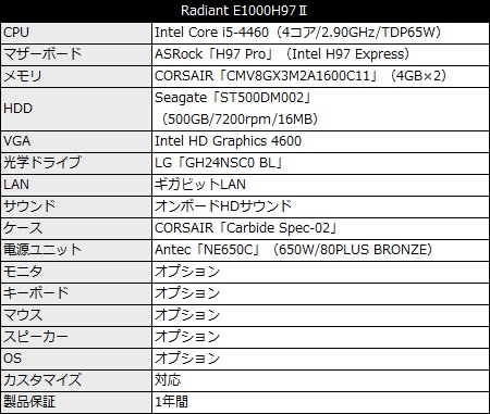 前回と同様、100台の台数限定モデルで、マザーボードはASRock「H97 Pro」(Intel H97 Express)、ストレージはSeagate「ST500DM002」(500GB/7,200rpm)とLG「GH24NSC0 BL」(DVDスーパーマルチドライブ)を標準装備。CPUはCore i5-4460で、Pentium G3258からCore i7-4790K(Xeon E3も対応)まで幅広く選択できる。