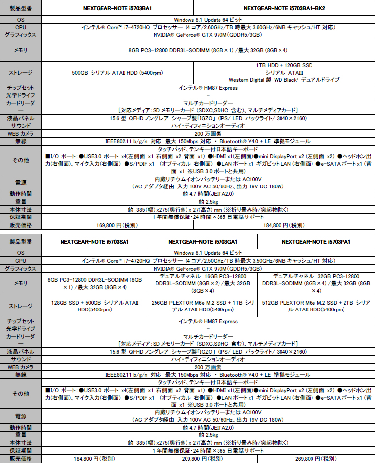 CPUは全機種Intel Core i7-4720HQで、チップセットにIntel HM87 Expressを採用。DDR3L 8GBからDDR3L 32GBまでのメインメモリ、500GB HDDからPLEXTOR「M6e」512GB SSD(M.2)+2TB HDDのストレージなど、計5種類のバリエーションを揃えた。
