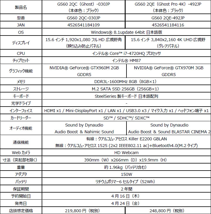 | 「GS60 2QC(Ghost)-030JP」「GS60 2QE(Ghost Pro)-492JP」 | |