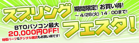 4月28日(火)14:00まで、パソコン工房では「スプリングフェスタ」を開催中。セール中は対象商品となるBTOパソコン、PCパーツ、周辺機器、おもしろ&デジタル雑貨を特別価格で販売。