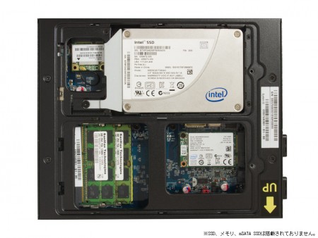 冷却にパッシブヒートシンクを採用したファンレスデザイン。メモリはDDR3 4GB×1(最大8GB×2)を実装、ストレージはmSATA SSD×1と2.5インチSSD/HDDを選択可能。SSDを組み合わせることで、ファンレス・ゼロスピンドル構成を構築できる。なおmSATA SSDを選択した場合、OSはmSATA SSD側にインストールされる。OSはWindows 8.1/7の各種エディションを選択可能だ。